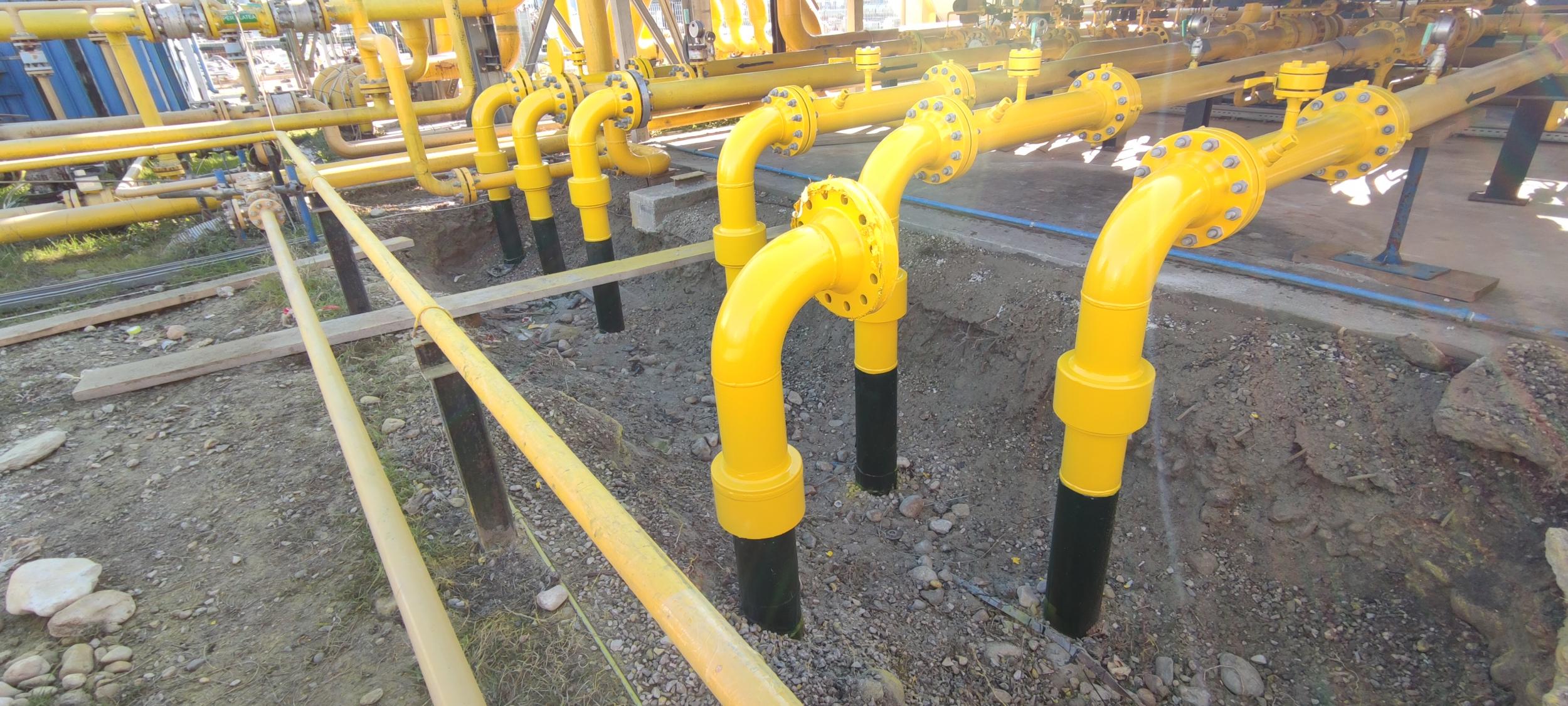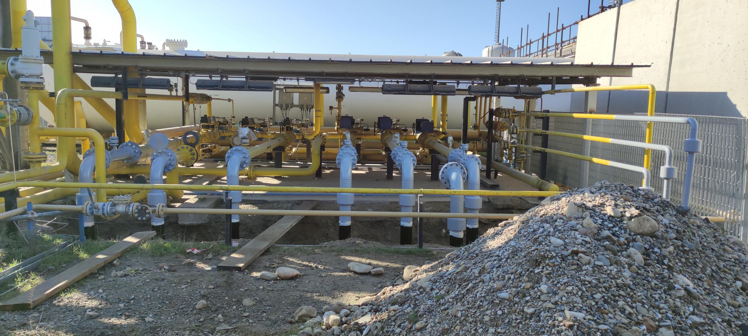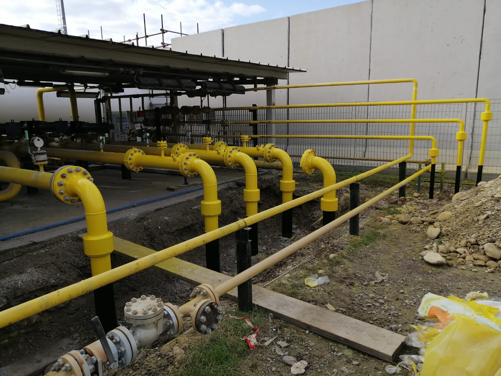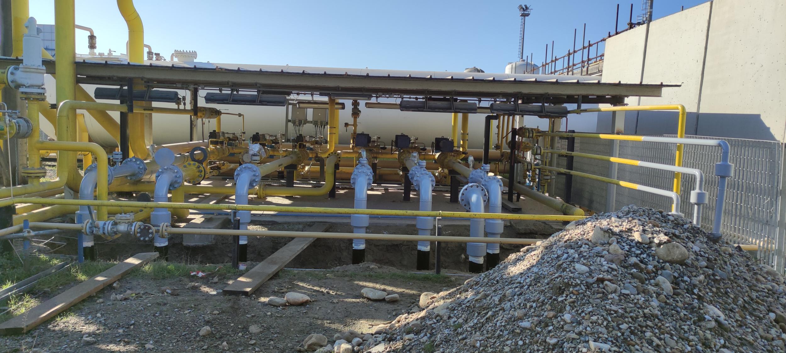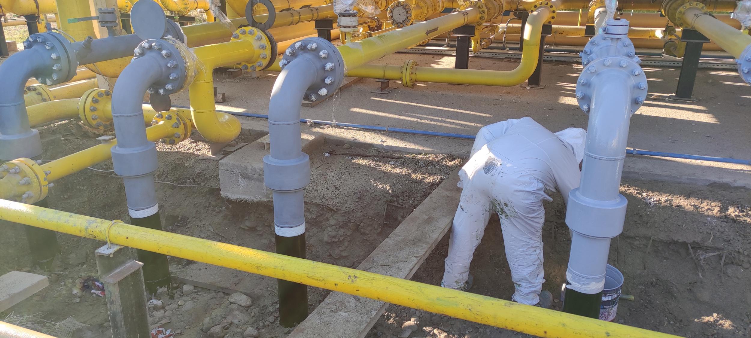 Esecuzione di nuovo rivestimento con IAMSUB (resina epossidica), sui tratti fuoriscenti dal terreno degli stacchi INAIL del manifold c/o Stabilimento BH Massa. Esecuzione ciclo in 3 passate sulle tubazioni fuori terra.